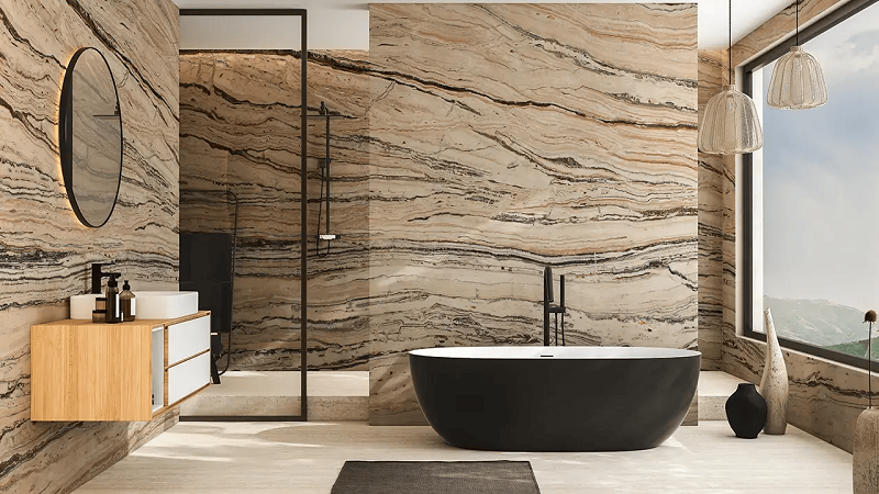 Пориста структура каменю не лише створює його впізнаваний зовнішній вигляд, а й забезпечує чудову тепло- та звукоізоляцію. Травертин накопичує тепло та поступово його віддає, завдяки чому приміщення довше зберігає комфортну температуру. А низький коефіцієнт водопоглинання (у низькопористих варіантів) робить його придатним для вологих приміщень без ризику утворення плісняви. Усе це робить травертин ідеальним вибором для облицювання ванних кімнат, кухонь і навіть саун.