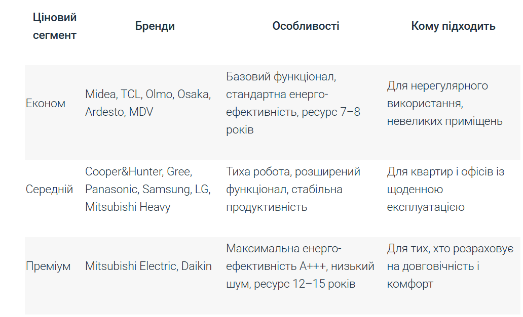 Порівняльна таблиця брендів кондиціонерів