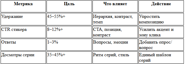 Перевіряйте метрики: утримання 3 с+, торкання "Ще" та CTR на стікери. Оптимум — 4–5 елементів та одна смислова домінанта