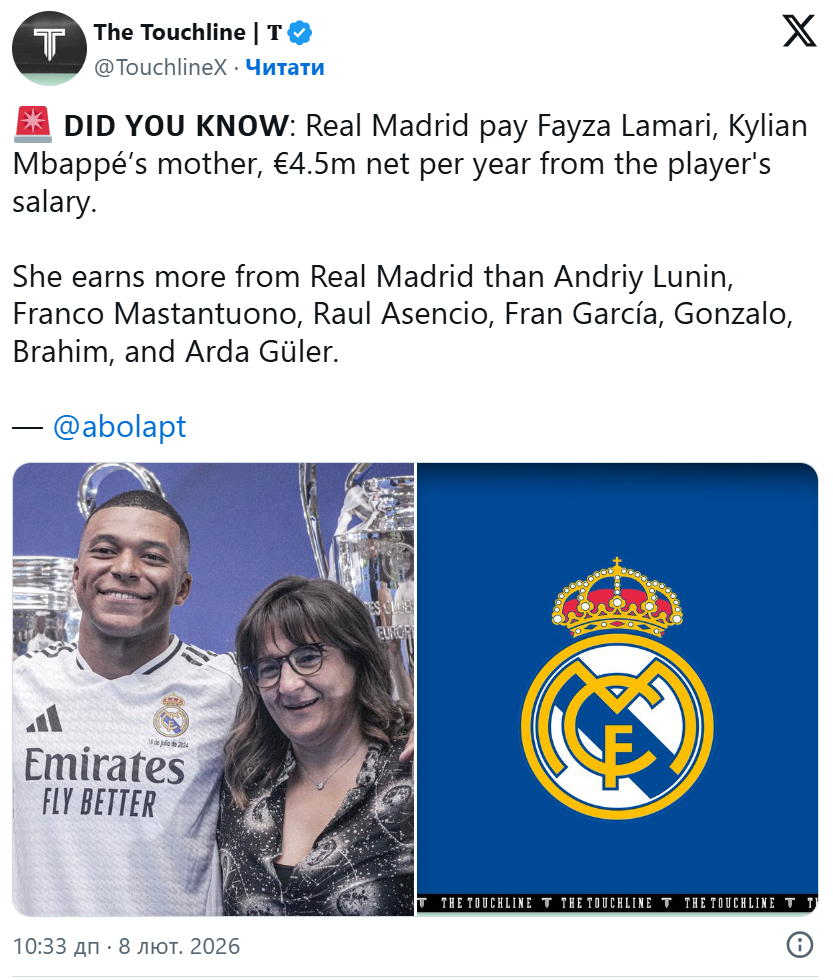 Мама Мбаппе заробляє в "Реалі" більше, ніж футболіст із Харківщини Андрій Лунін.