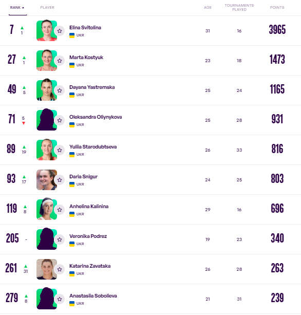 Серед інших українок також відбулися зміни. Марта Костюк піднялася на 27-му позицію, Даяна Ястремська - на 49-ту. Юлія Стародубцева повернулася до першої сотні та посідає 89-те місце.