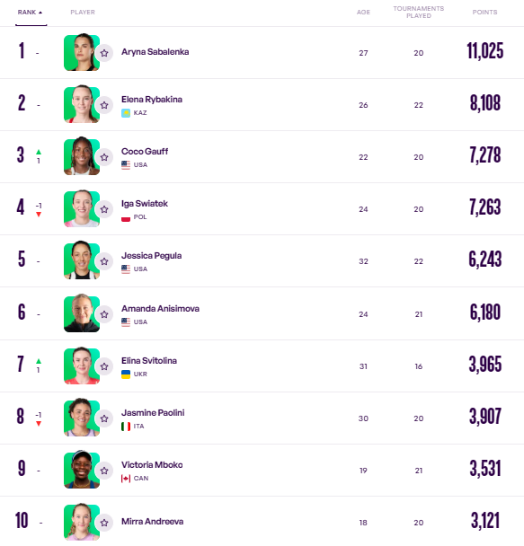 Лідеркою рейтингу залишається Аріна Соболенко, другою йде Єлена Рибакіна, а топ-5 замикає Джессіка Пегула.
