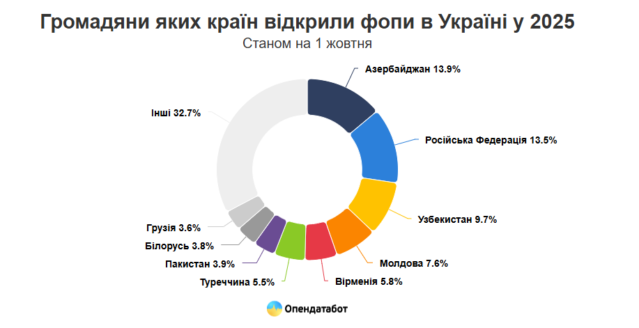 Найактивніше бізнес в Україні відкривали громадяни Азербайджану (229 фопів), Росії (222) та Узбекистану (160). Натомість найчастіше припиняли діяльність саме російські підприємці - 241 фоп.