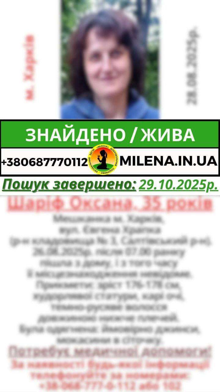 За даними рятувального загону, у Харкові знайшлася 35-річна Оксана Шаріф, яку розшукували з кінця серпня.