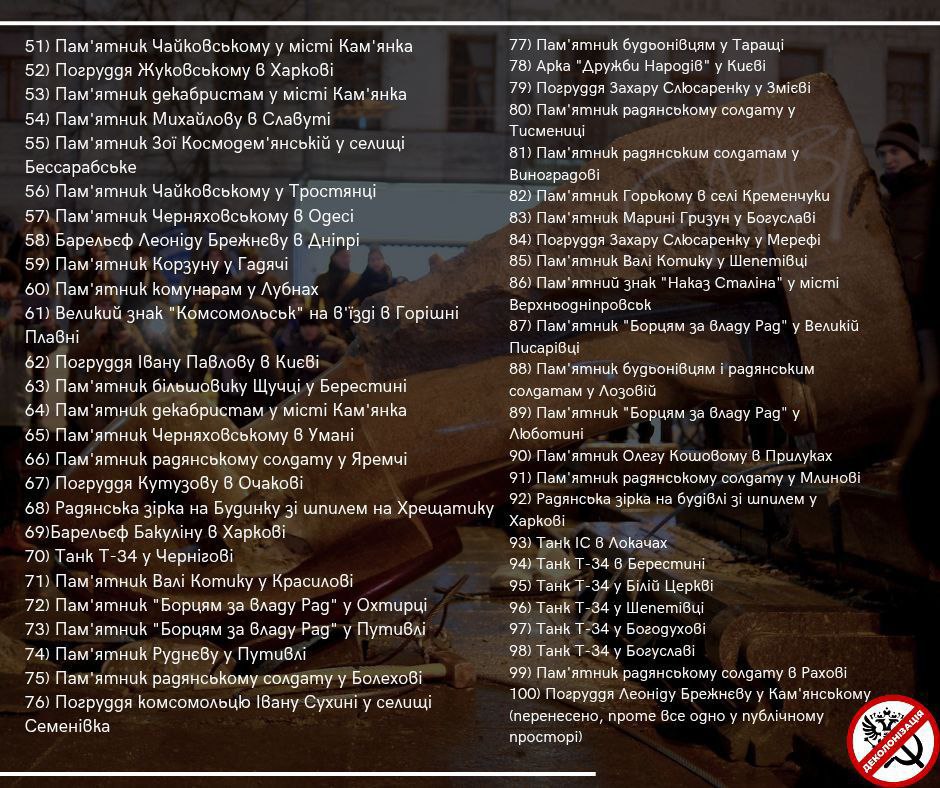 Також у списку — пам’ятники інтернаціоналістам біля станції метро "Наукова", погруддя Гагаріну, Жуковському, Шумілову, барельєф Бакуліну, танки Т-34 у Берестині та Богодухові, а також низка радянських меморіалів у Змієві, Люботині та Лозовій.