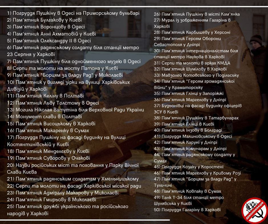 Організація оприлюднила оновлений список із 100 об’єктів по всій країні, які рекомендують демонтувати в межах процесу декомунізації та деколонізації.