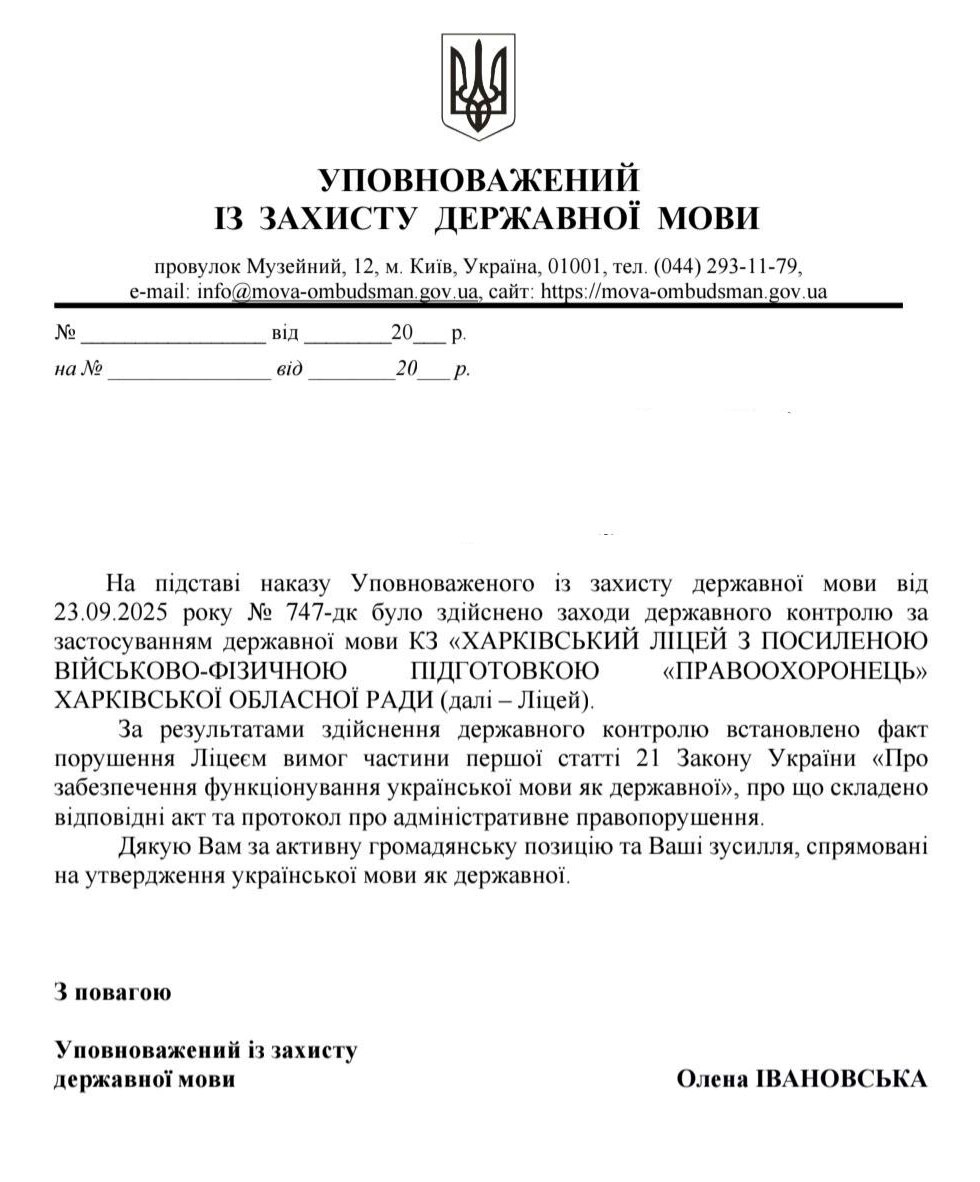 Зазначається, що комунальний заклад "Харківський ліцей з посиленою військово-фізичною підготовкою "Правоохоронець" отримав протокол за адмінправопорушення. Йдеться про порушення мовного закону.