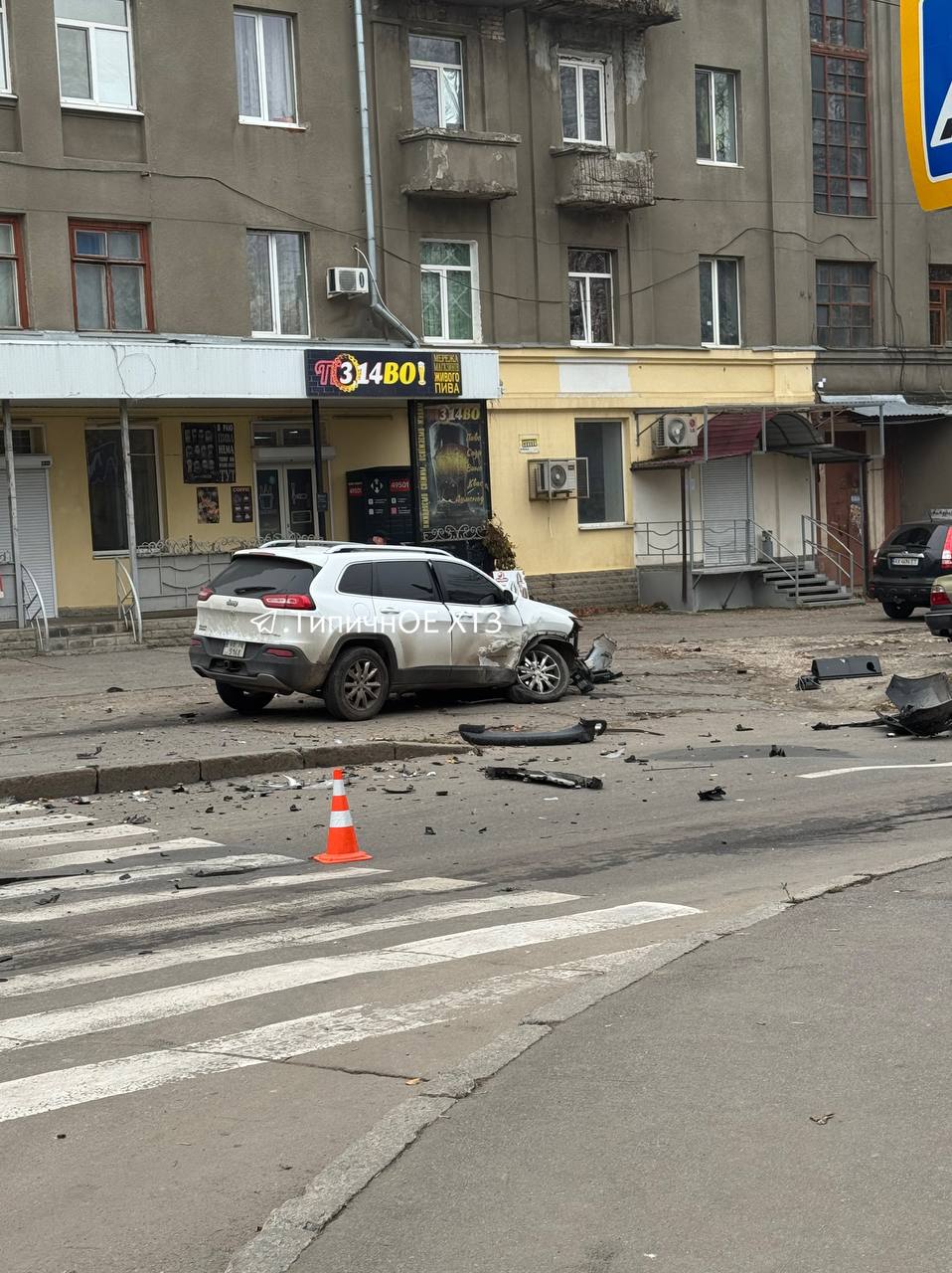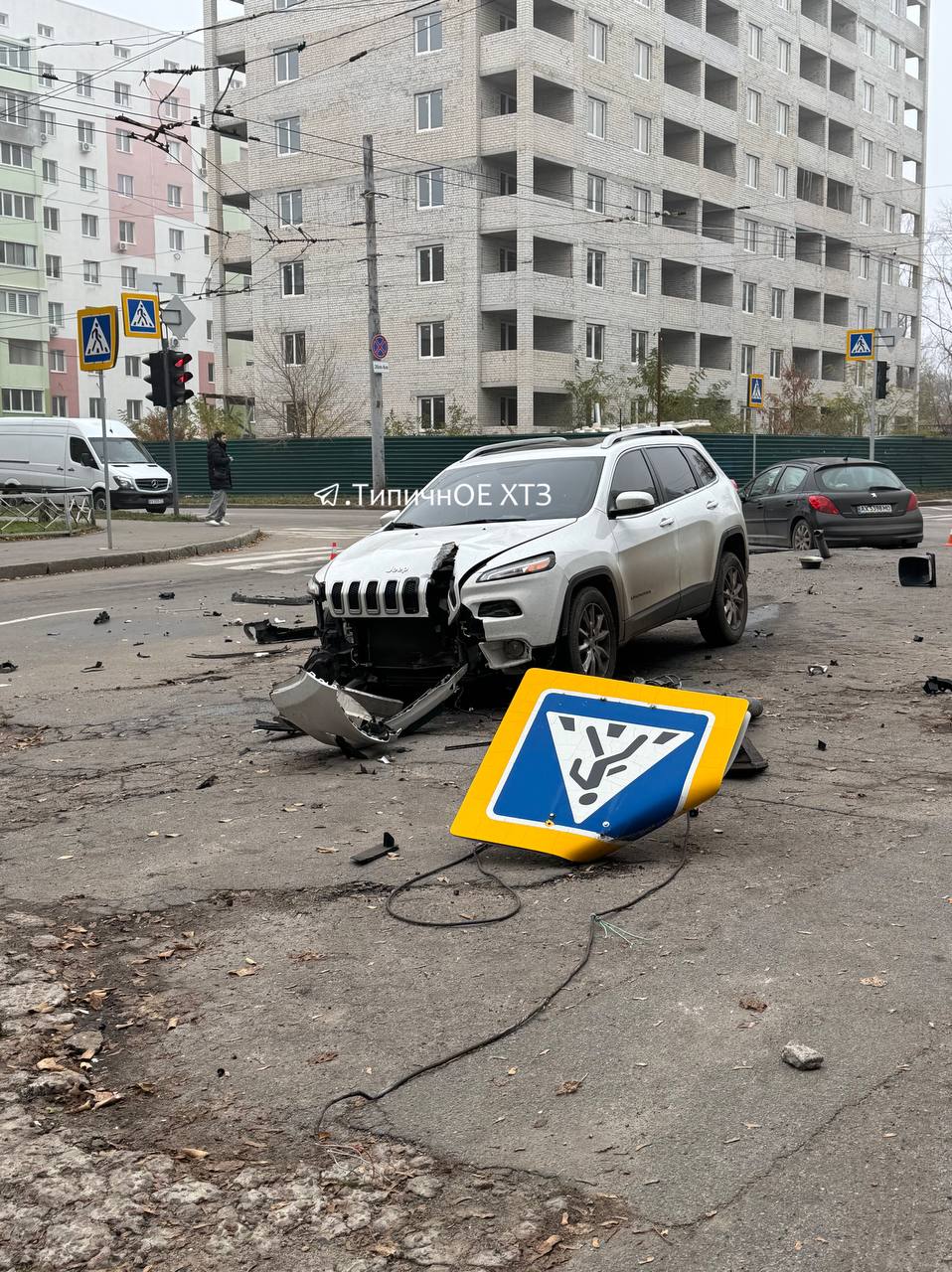 У результаті удару обидві машини отримали значні пошкодження: в однієї повністю зім’ятий перед, інша — знесла стовп зі знаком. На місці видно уламки бамперів, фари та розлите мастило.