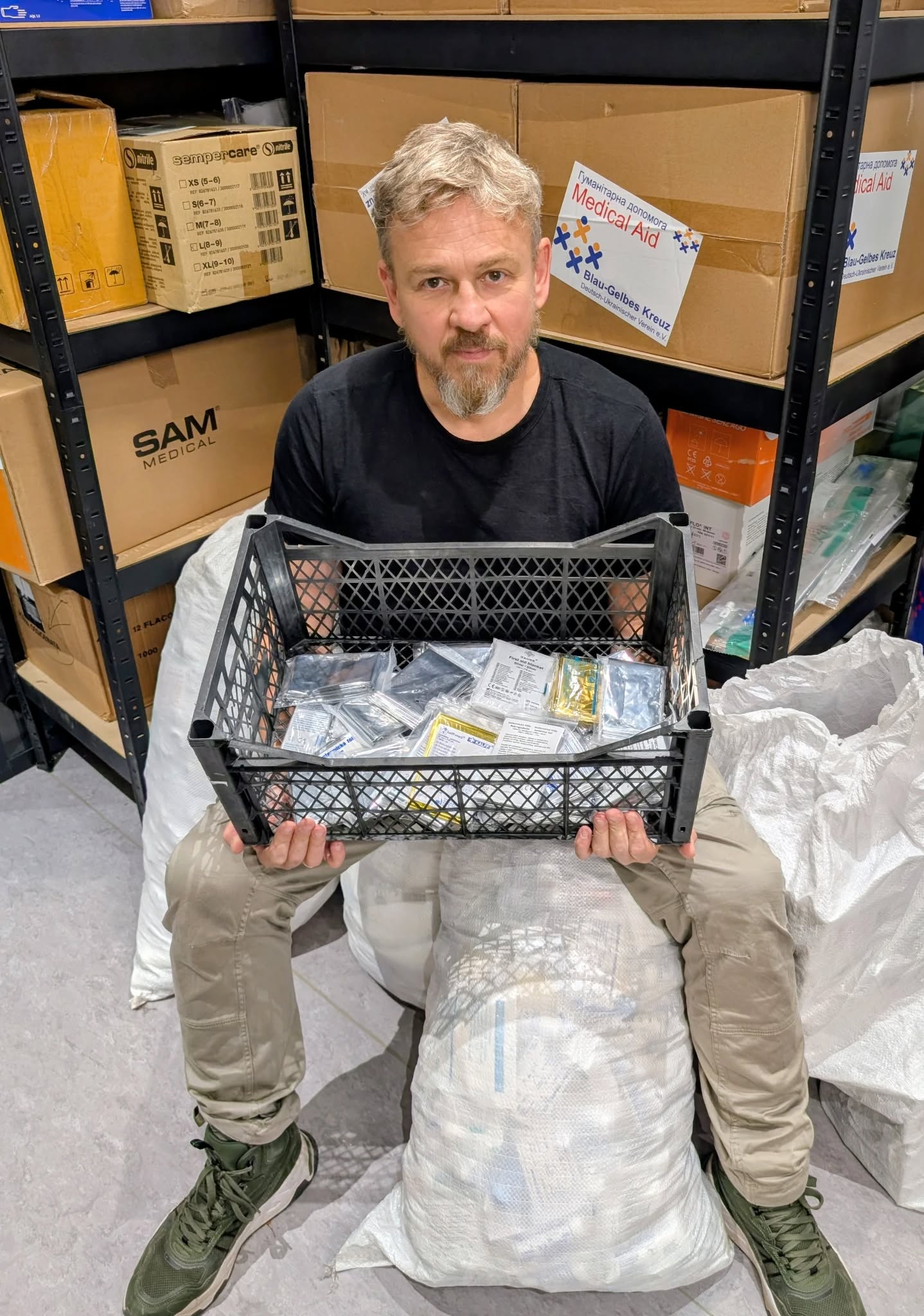 У своєму дописі виклав фото, на якому — цілі мішки з медичними виробами, відібраними з європейських гуманітарних вантажів. Його волонтерська команда щодня приймає рішення: викидати тисячі автомобільних аптечок, які вже встигли "прострочитися". Навіть такі, здавалося б, прості речі, як термоковдри та трикутні пов'язки, не минають цього жорстокого відбору.