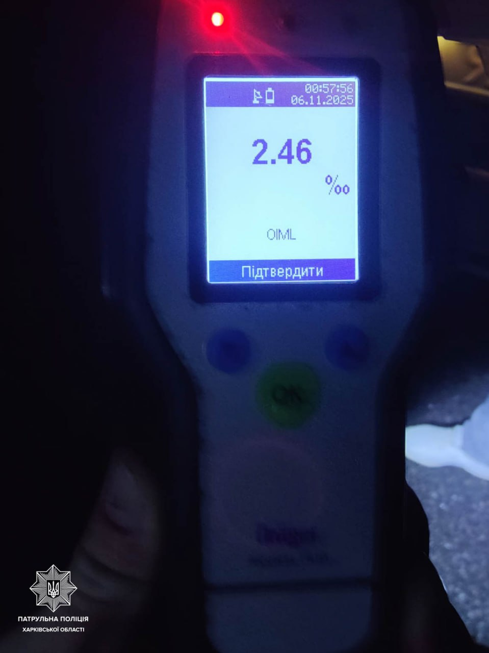 У Харкові зупинили водія з 2,46 проміле та підробленим посвідченням.