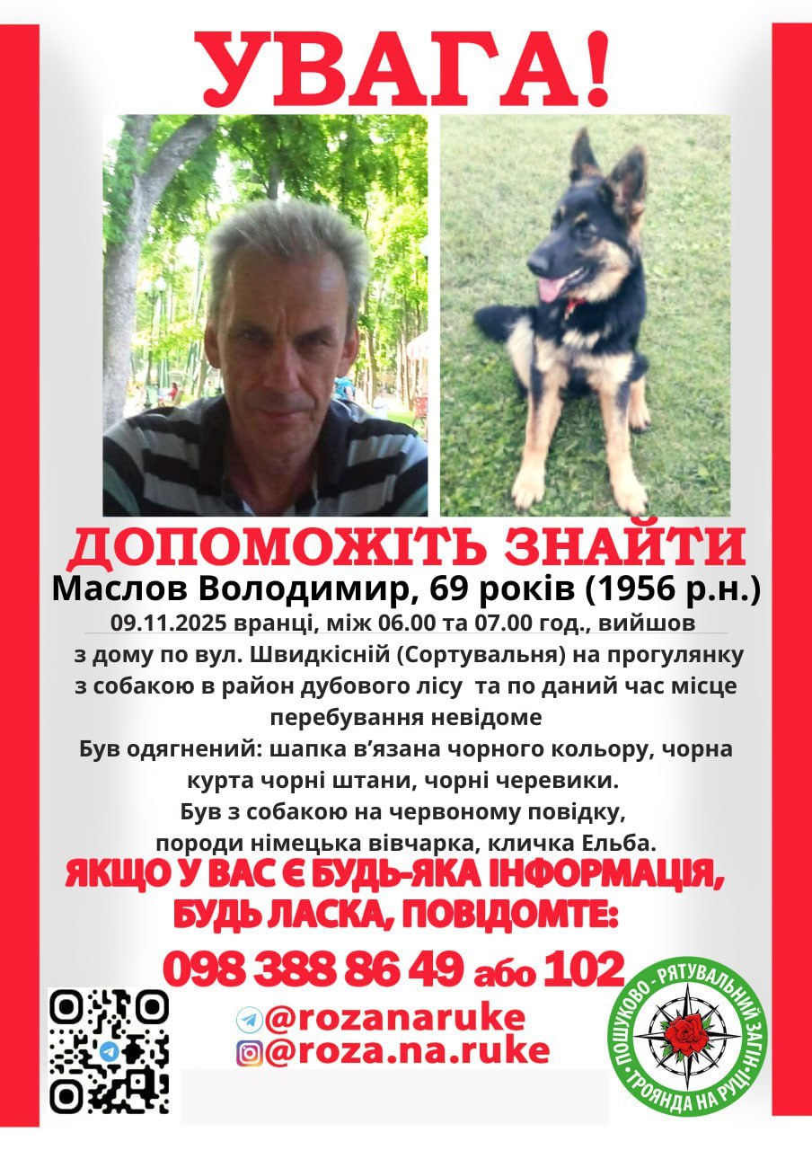 За даними ПРЗ, 69-річний Володимир Маслов вийшов з добу вигуляти собаку 9 листопада близько 6 ранку. Чоловік мешкає на вулиці Швидкісній. Пішов гуляти у бік дубового лісу і до цього часу його місце перебування.