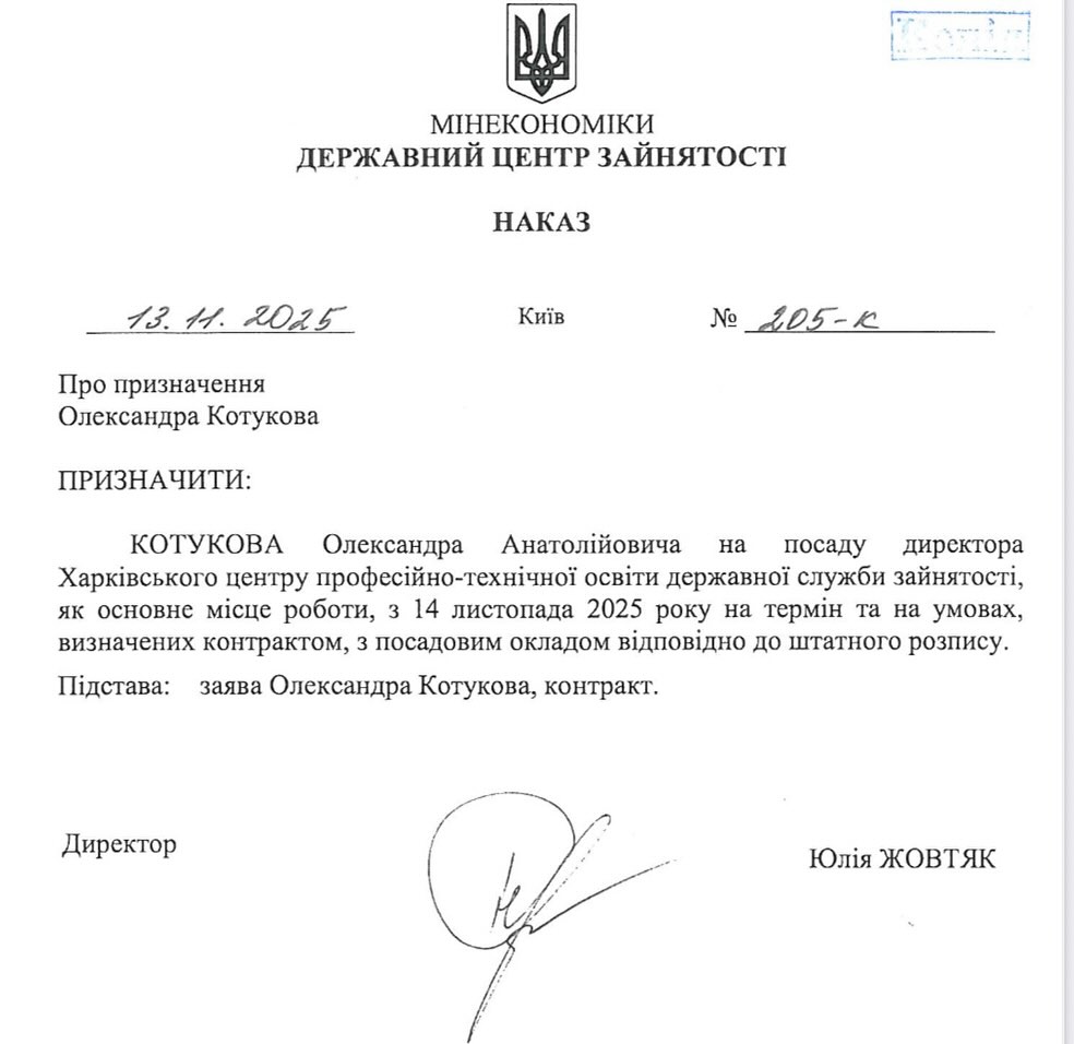 Котуков сповістив про призначення на посаду керівника Харківського центру професійно-технічної освіти Державної служби зайнятості, новий етап роботи розпочався з 14 листопада.