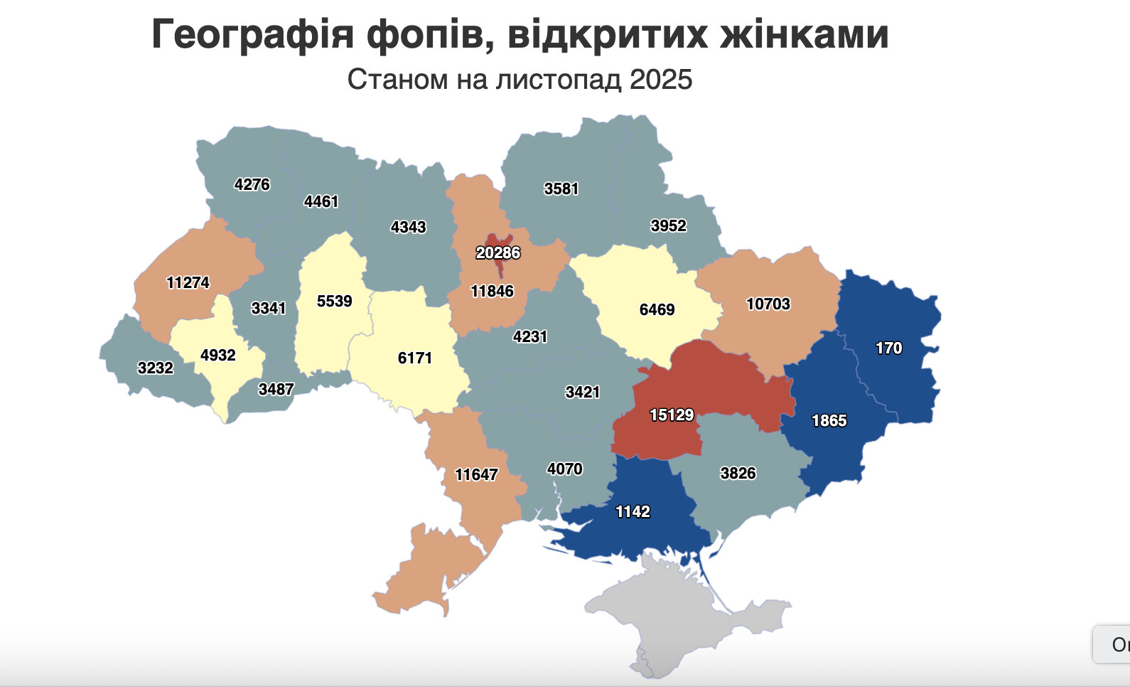 За даними Єдиного державного реєстру, у січні–жовтні 2025 року жінки зареєстрували 153 413 нових ФОП — це 61% від усіх новостворених підприємств країни. Для порівняння, у 2021 році частка жінок серед нових підприємців була 51%.