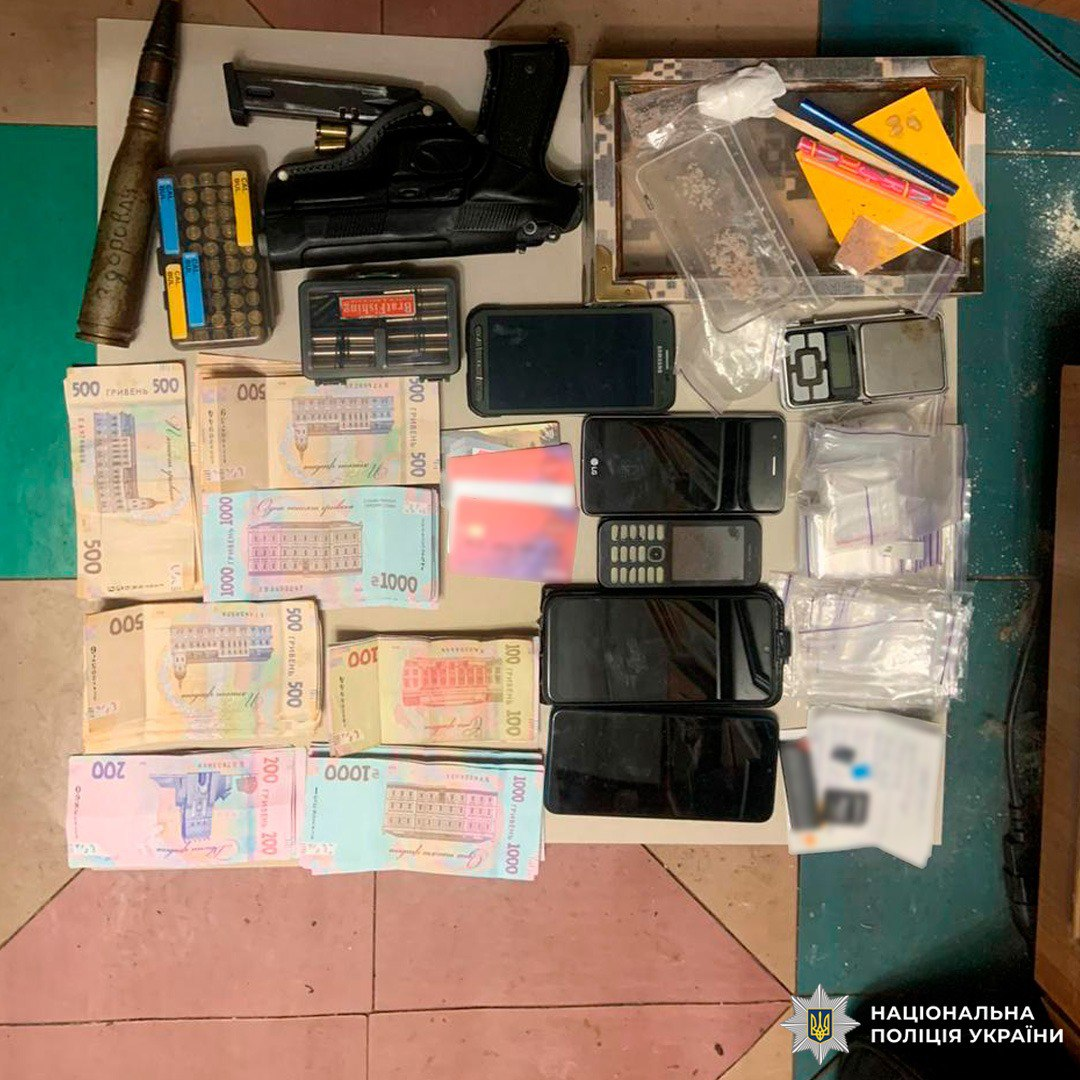 Під час двох обшуків правоохоронці вилучили близько 30 грамів метамфетаміну, 6 грамів амфетаміну, 14 кг метамфетаміну в рідкому стані на завершальному етапі виробництва, прекурсори, лабораторне обладнання, телефони, банківські картки і понад 100 тис. грн, отриманих від продажу наркотиків, а також пістолет і набої.