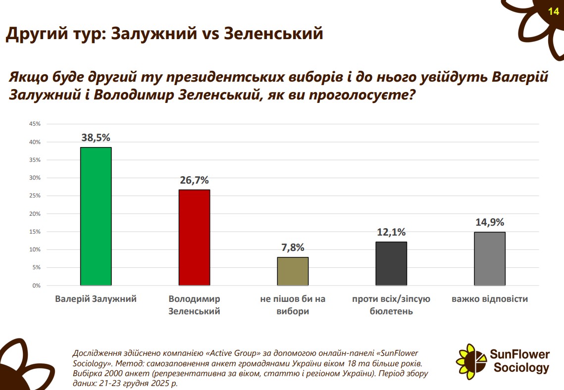 У другому ж турі перевагу демонструє Валерій Залужний. У парі з Володимиром Зеленським він отримує 38,5% підтримки проти 26,7%. У протистоянні з Кирилом Будановим – 34,6% проти 28,7%. Водночас сценарій другого туру між Володимиром Зеленським та Кирилом Будановим виглядає найбільш конкурентним: 32,1% підтримали б Буданова, 29,8% – Зеленського.