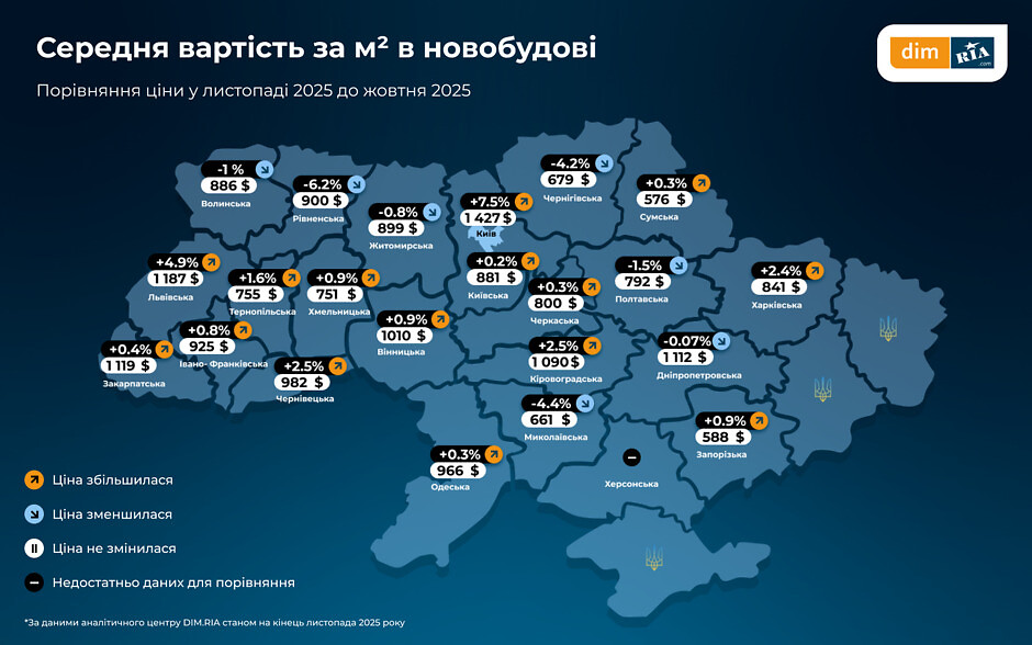 Водночас попит на нове житло в області дещо знизився - на 0,9% у порівнянні з жовтнем.