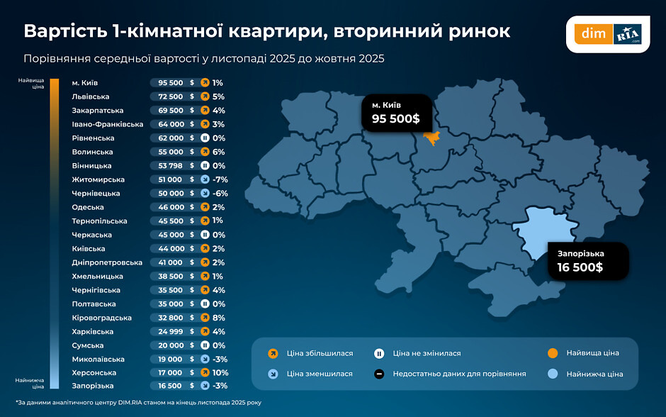 - 1-кімнатні квартири - середня ціна 24 999 дол., зростання на 4%;