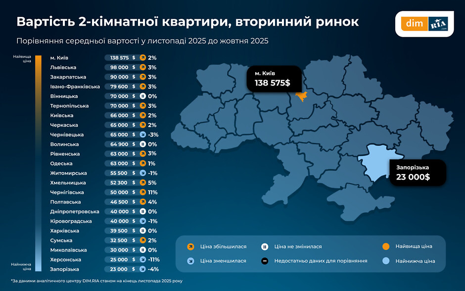 - 2-кімнатні квартири - 39 500 дол., без змін;