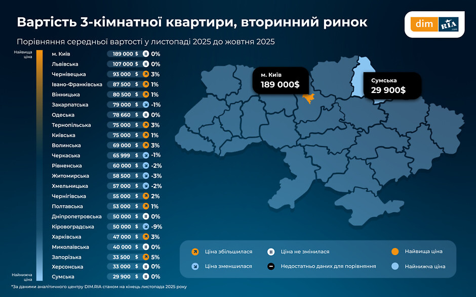 - 3-кімнатні квартири - 47 тис. дол., зростання на 3%.