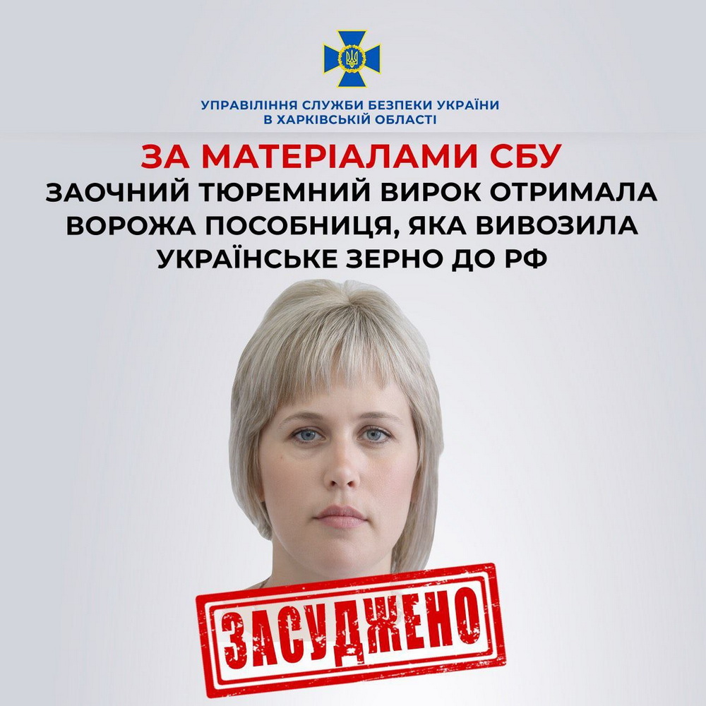 37-річній жінці з Куп’янщини, яка у 2022 році допомагала окупантам незаконно вивозити українське зерно до росії, заочно присудили 11 років ув’язнення з конфіскацією майна.