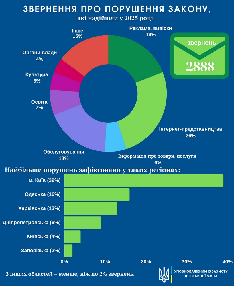 Загалом 2888 звернень (для порівняння: у 2024 році - 2314) були пов’язані з імовірними порушеннями Закону України "Про забезпечення функціонування української мови як державної".