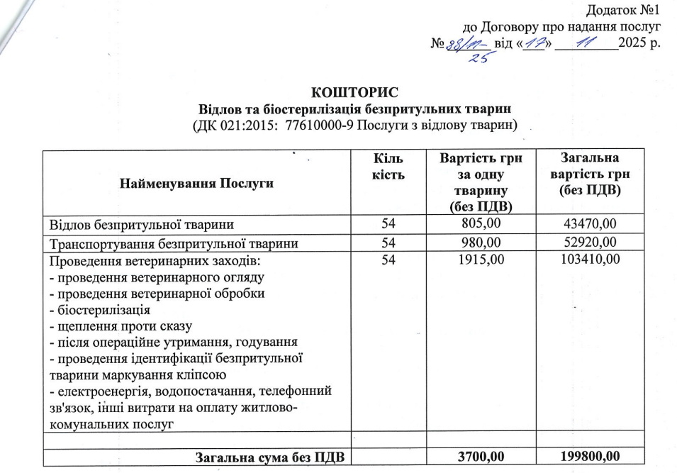 Вартість послуг для однієї тварини становитиме в середньому 10 892 грн, при цьому для дорослих особин сума є вищою через більший обсяг процедур.