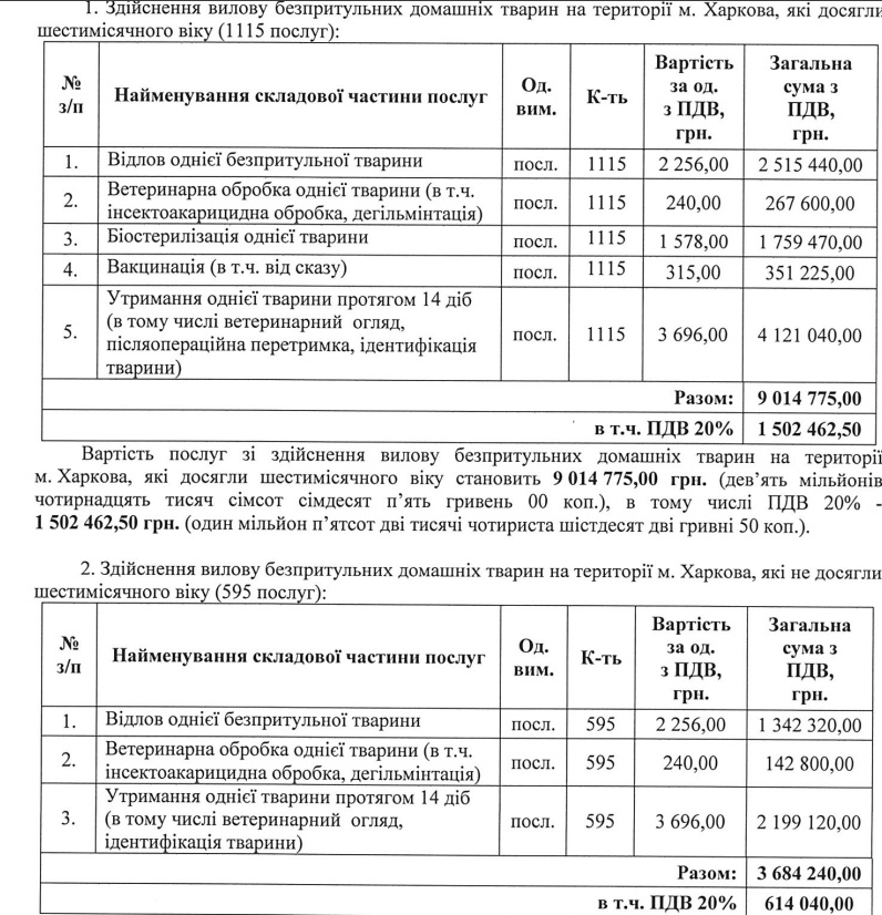 Згідно з технічною документацією, впродовж року в Харкові планують виловити 1166 безпритульних тварин, з яких 1023 - дорослі особини та 143 - тварини віком до шести місяців.