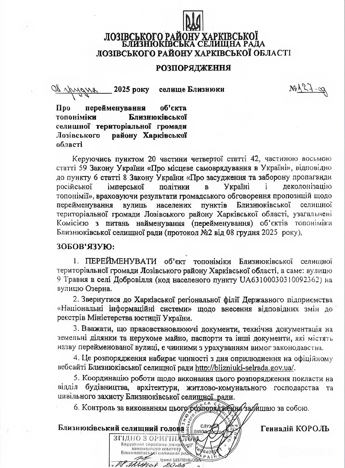 За даними активістів, у Близнюківській громаді Лозівського району Харківської області 8 грудня 2025 року прийнято розпорядження про перейменування останньої вулиці, що підлягала зміні в рамках закону про деколонізацію топонімів.