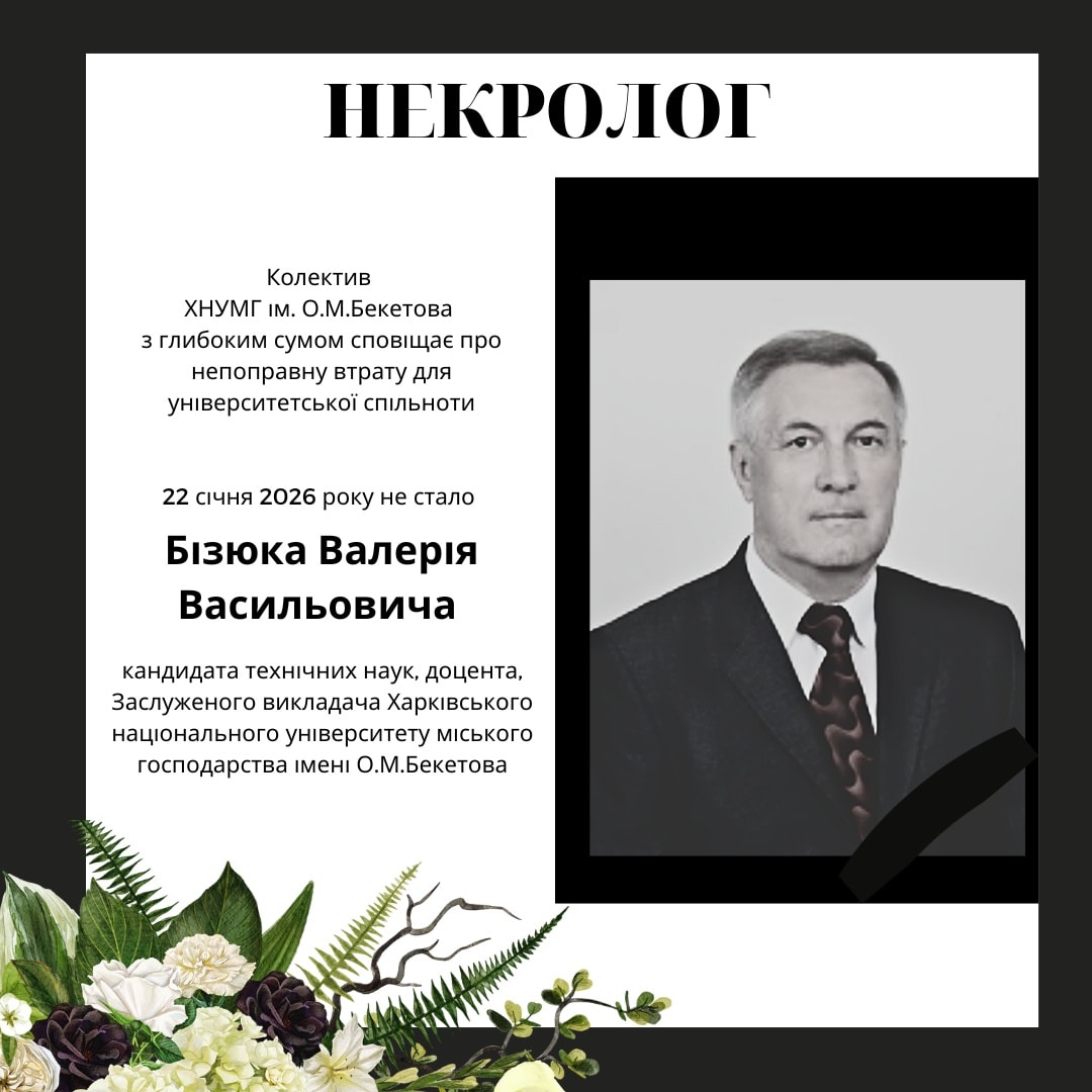 За даними університету, у Харкові 22 січня 2026 року пішов із життя кандидат технічних наук, доцент і заслужений викладач Харківського національного університету міського господарства імені О.М. Бекетова Валерій Бізюк. Йому було 79 років, до 80-річчя він не дожив п’яти днів.