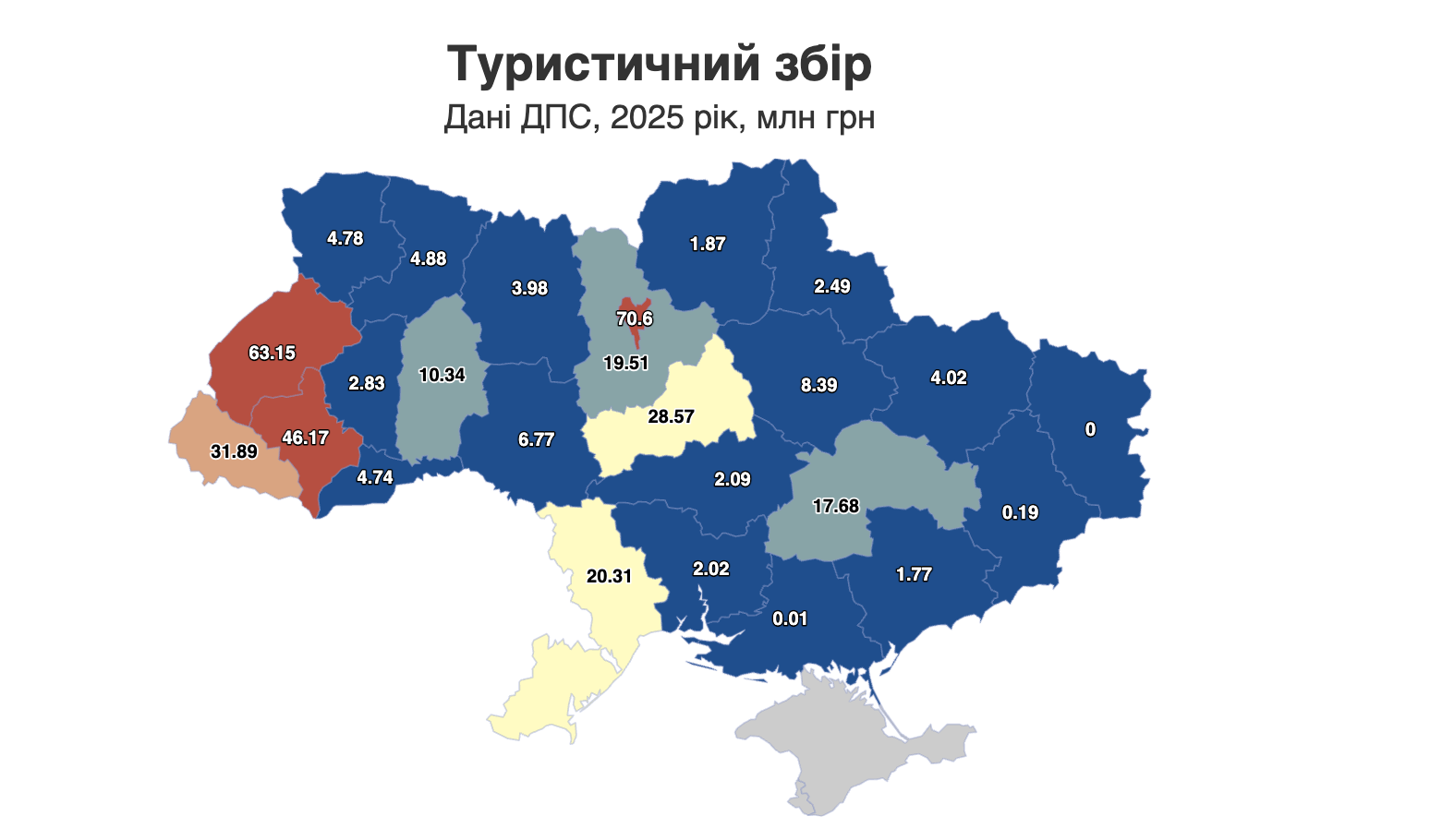 Область посіла лише 15-те місце з 4,02 млн грн туристичного збору. Для порівняння: лідер — Київ — зібрав 70,6 млн грн, Львівщина — 63,15 млн, Хмельниччина — 46,17 млн.