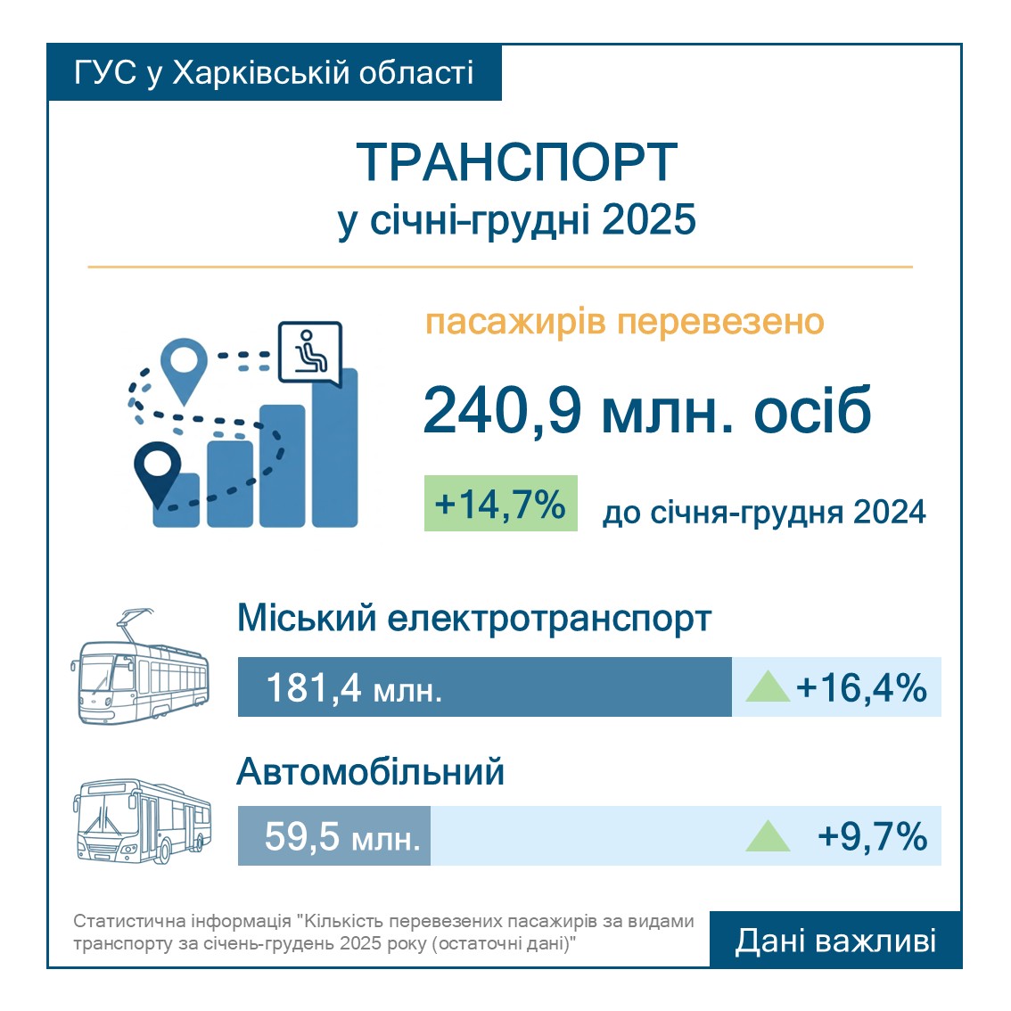 Пасажиропотік — 240,9 млн осіб за рік. Це на 14,7% більше, ніж у 2024-му. Найбільше харків'яни їздили трамваями, тролейбусами та метро — міський електротранспорт перевіз 181,4 млн пасажирів (+16,4% до 2024-го). Автобуси — 59,5 млн (+9,7%).