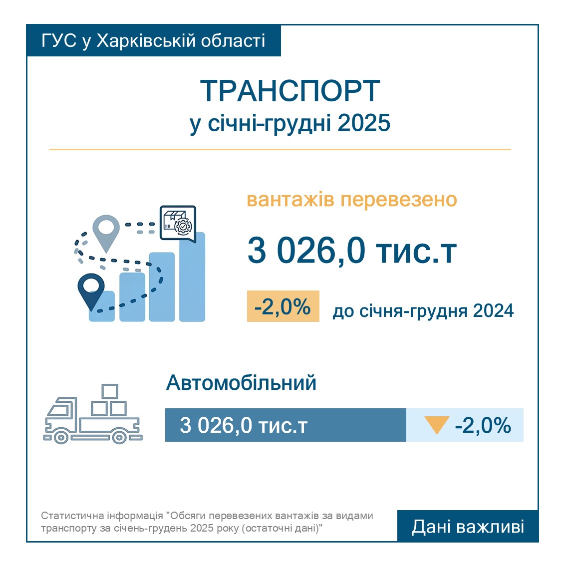 Окремо статистики оприлюднили помісячні показники вантажообігу за 2025 рік та січень 2026-го. Дані демонструють значне падіння в червні 2025 року — зі 104 у січні до 98,6 у червні. У наступні місяці показники коливалися на рівні 97–99, а в грудні відновилися до 100,9. Січень 2026 року показав 102,1 — це на 1,9% менше, ніж у січні 2025-го (104).
