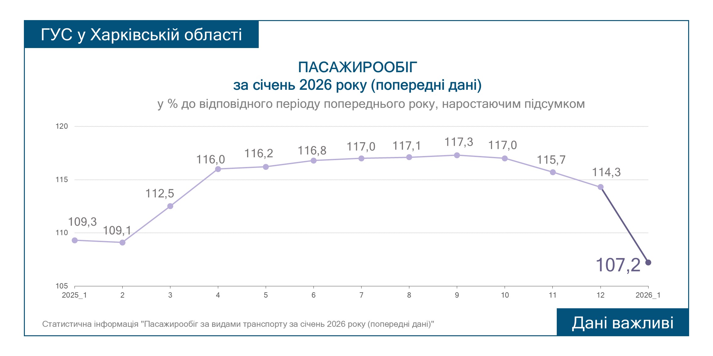 Щодо пасажирообігу, то у січні 2025 він становив 109,3, а у січні 2026 — 107,2, що свідчить про незначне зниження на 2%.