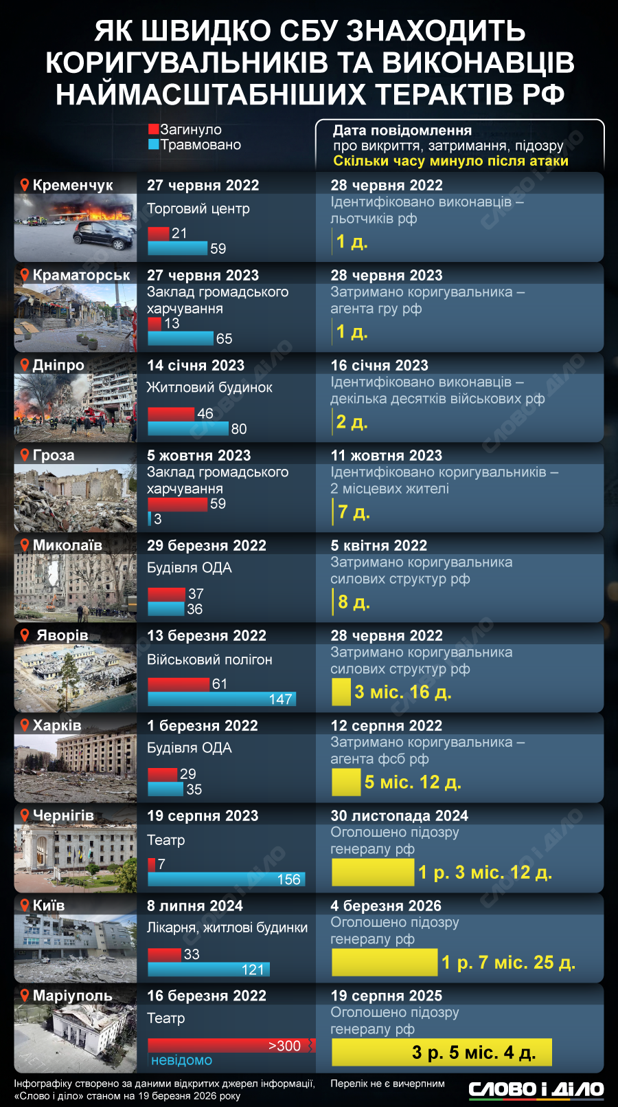 За даними ЗМІ, українські правоохоронці у різні терміни встановлюють винних у ракетних ударах – від кількох днів до кількох років. Найшвидше вдається виходити на коригувальників, які працюють безпосередньо "на місці".