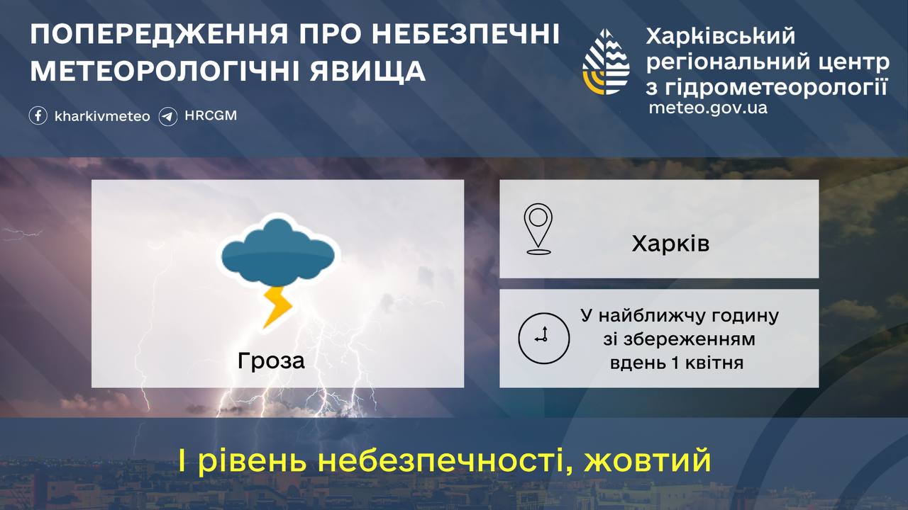 У Харкові оголосили жовтий рівень небезпеки через грозу 1 квітня.
