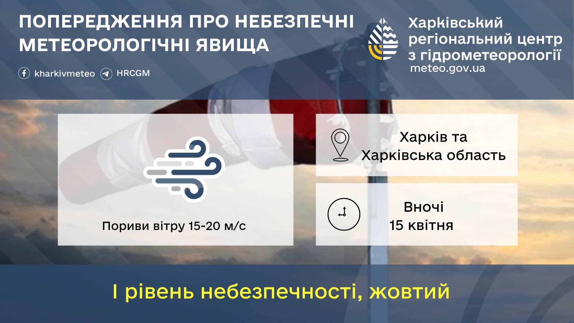 За даними центру, у ніч на 15 квітня прогнозують пориви вітру швидкістю 15–20 м/с в Харкові та області.