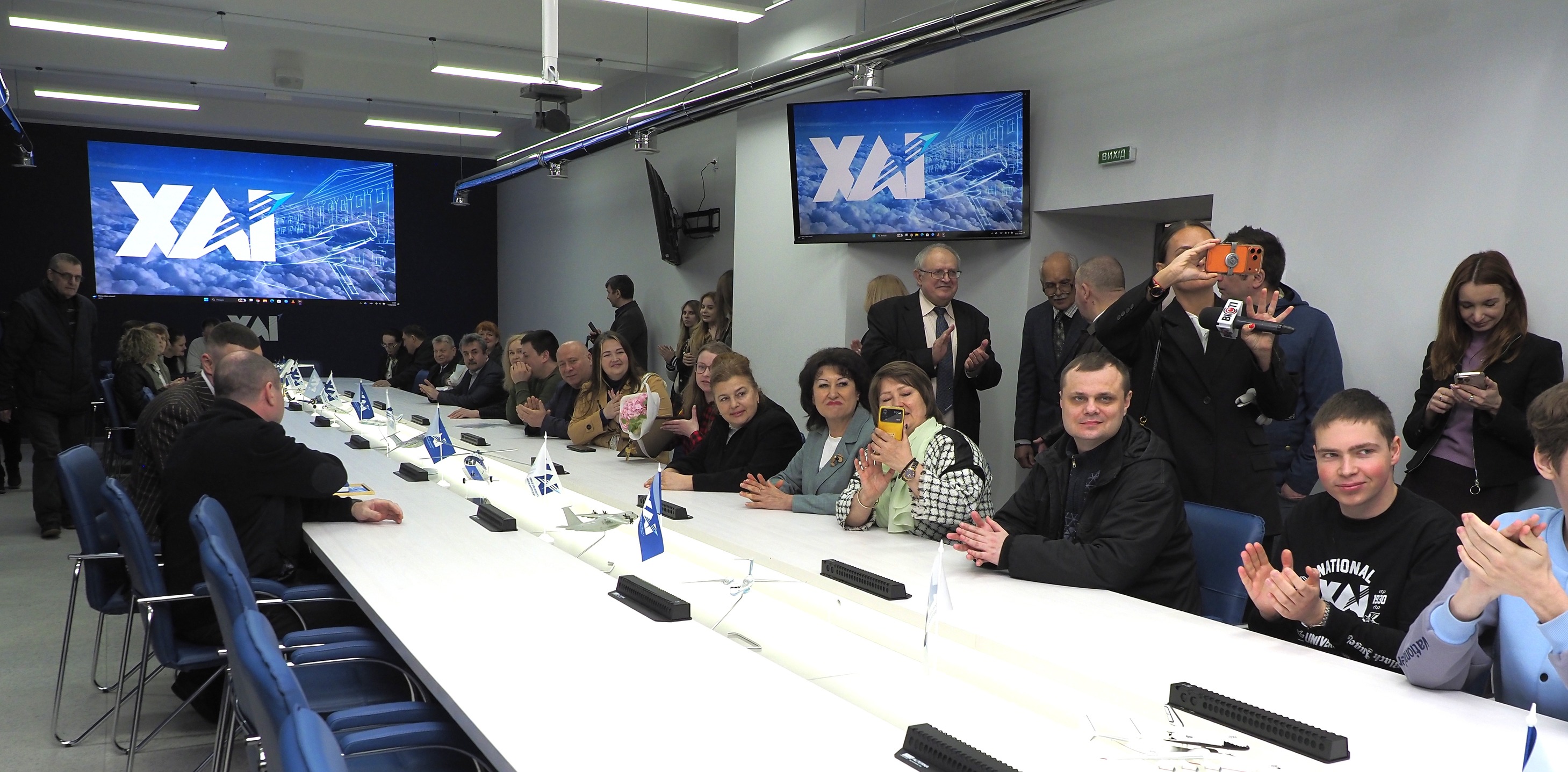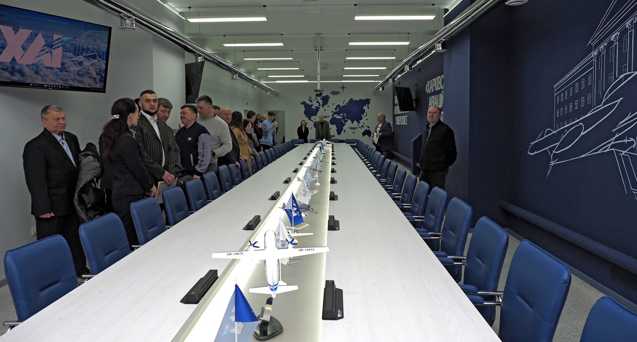 Зала оснащена великим LED-екраном, камерами з оглядом 360 градусів та мікрофонами із сенсорним керуванням. Від проєкту до реалізації цей простір створено власними силами ХАІ.