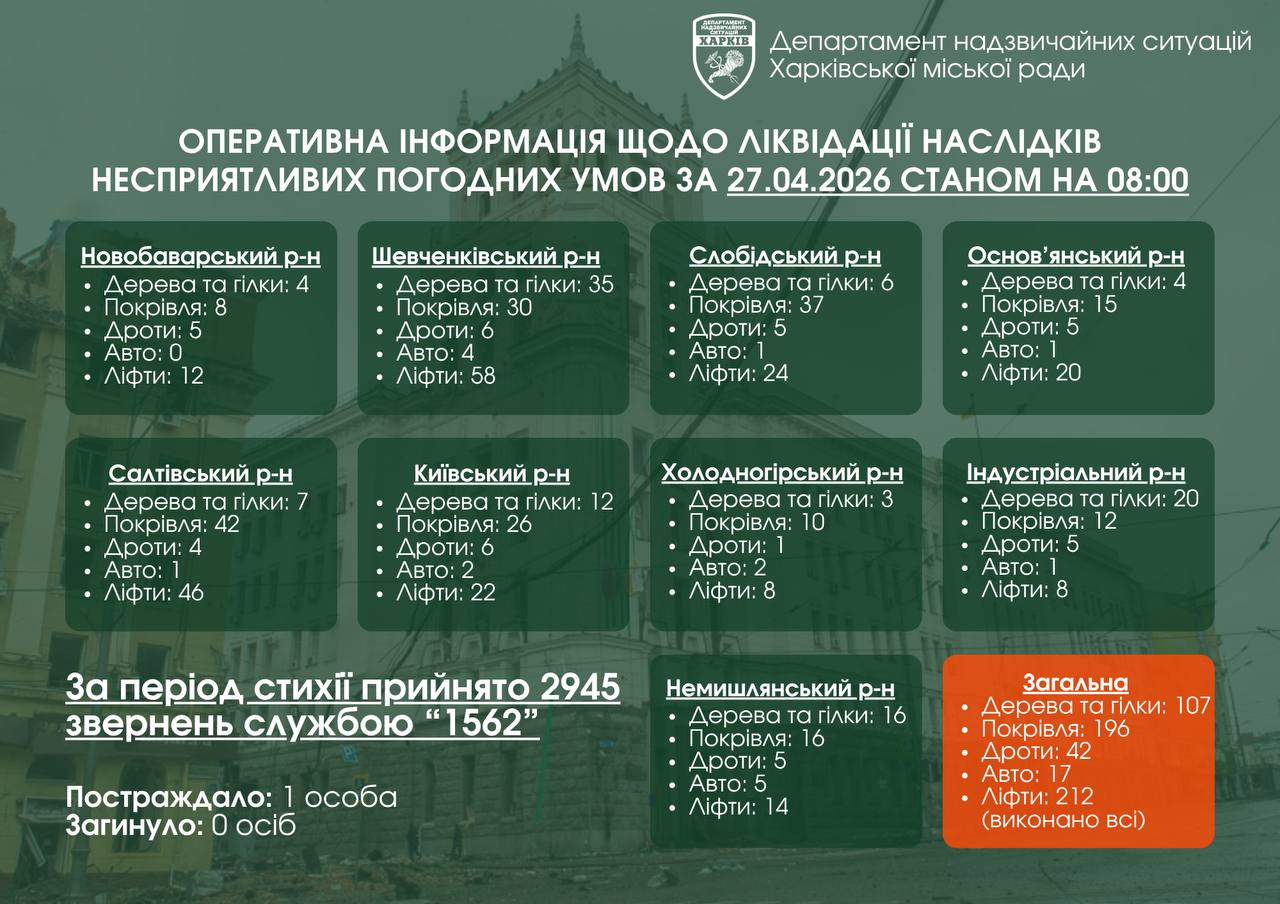 У неділю, 26 квітня, Харків накрила негода зі шквальним вітром, який спричинив пошкодження інфраструктури в усіх районах міста.