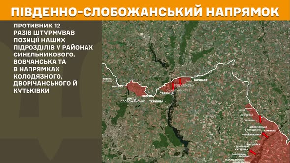 За даними військових, на Південно-Слобожанському напрямку противник 12 разів штурмував позиції наших підрозділів у районах Синельникового, Вовчанська та в напрямках Колодязного, Дворічанського й Кутьківки.