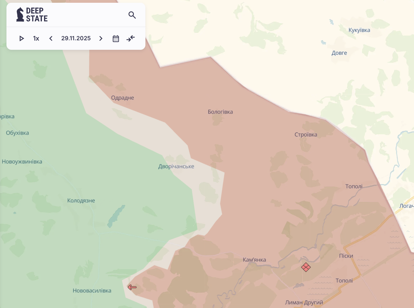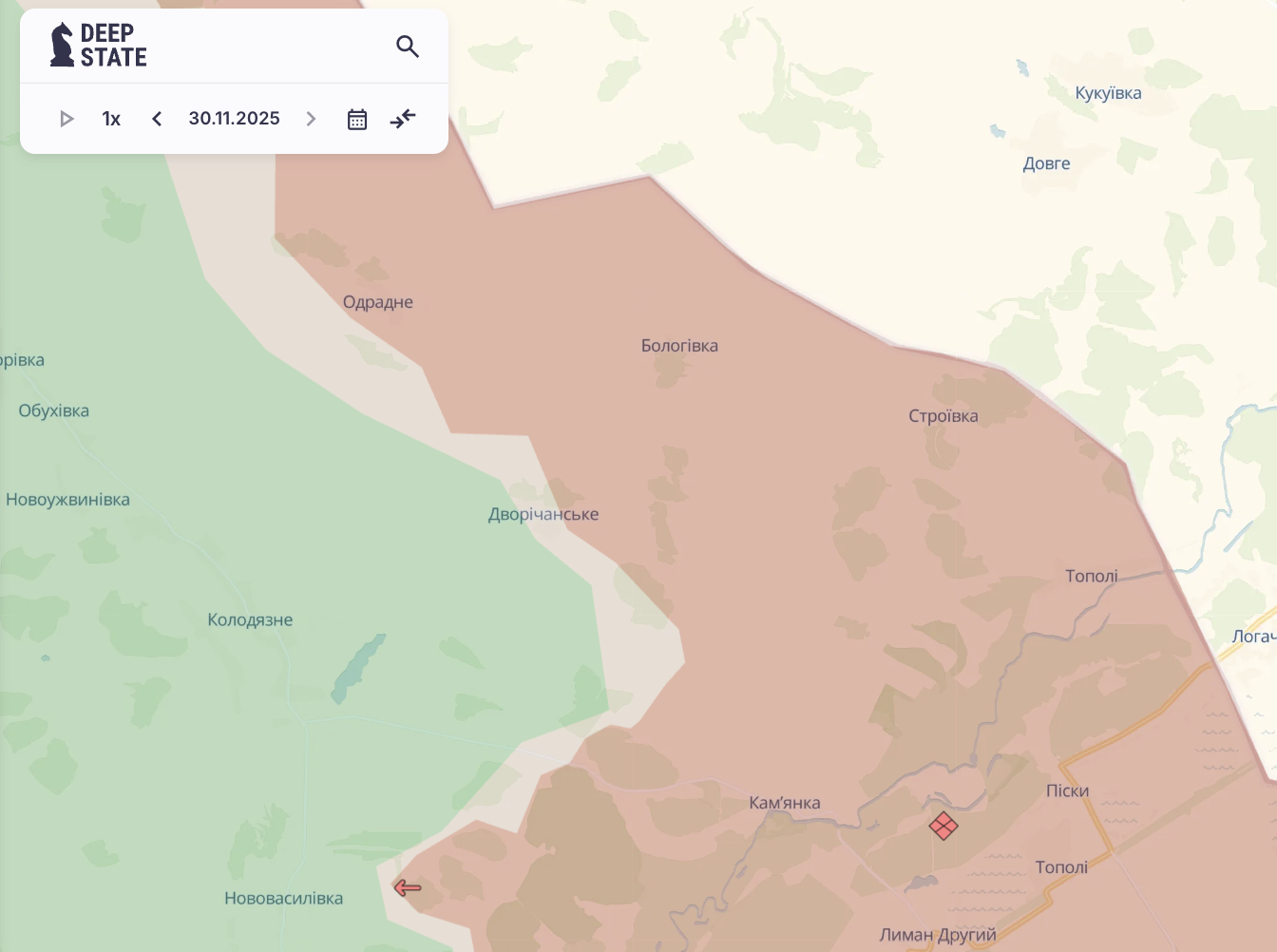 Зіставлення карт за 29 та 30 листопада показує, що лінія зіткнення в цьому районі змістилася, що вказує на тимчасовий тактичний успіх противника. Проєкт повідомляє, що ворог просунувся саме в цьому напрямку.