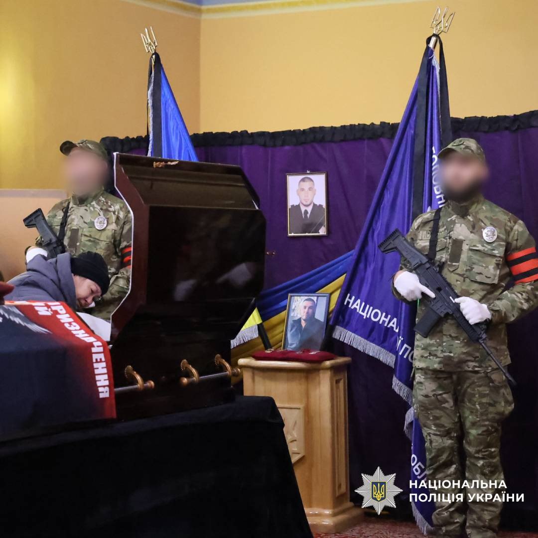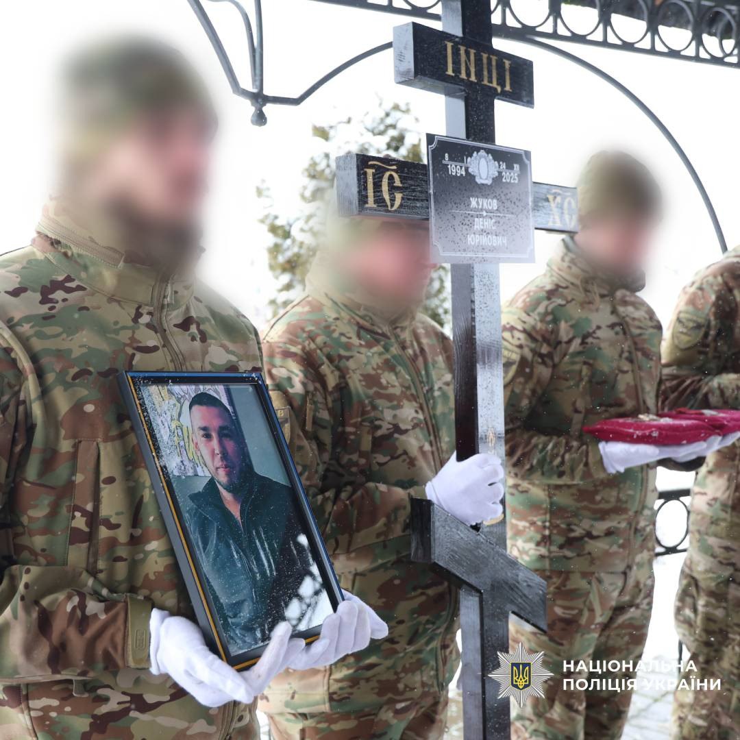 За даними поліції, з почестями в останню путь провели поліцейського взводу №1 роти №4 батальйону поліції особливого призначення (стрілецький) Головного управління Національної поліції в Харківській області Дениса Жукова.