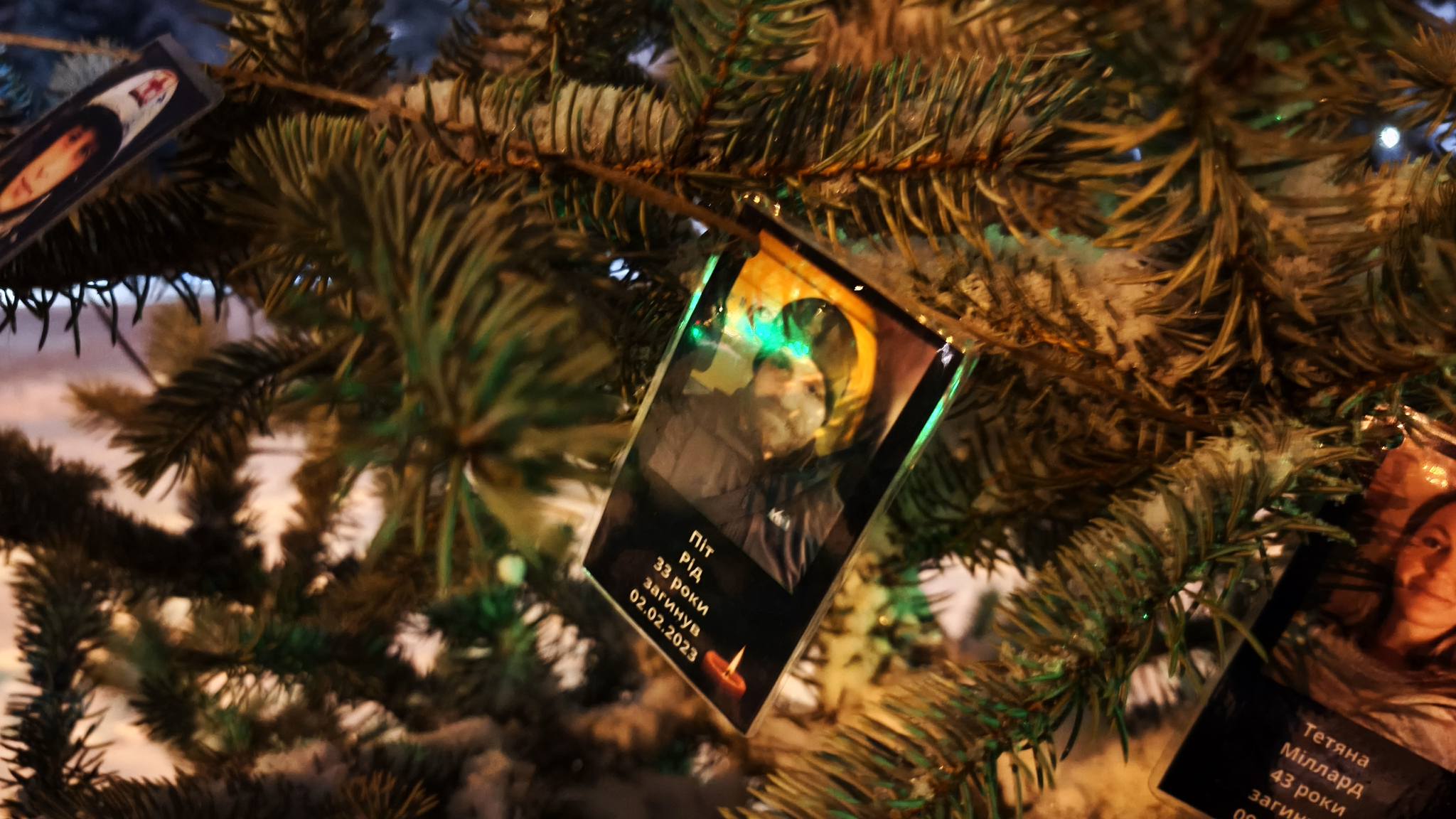 Замість святкових прикрас на дереві розмістили фотографії волонтерів, які до останнього рятували цивільних у прифронтових громадах і загинули під час виконання своєї місії.