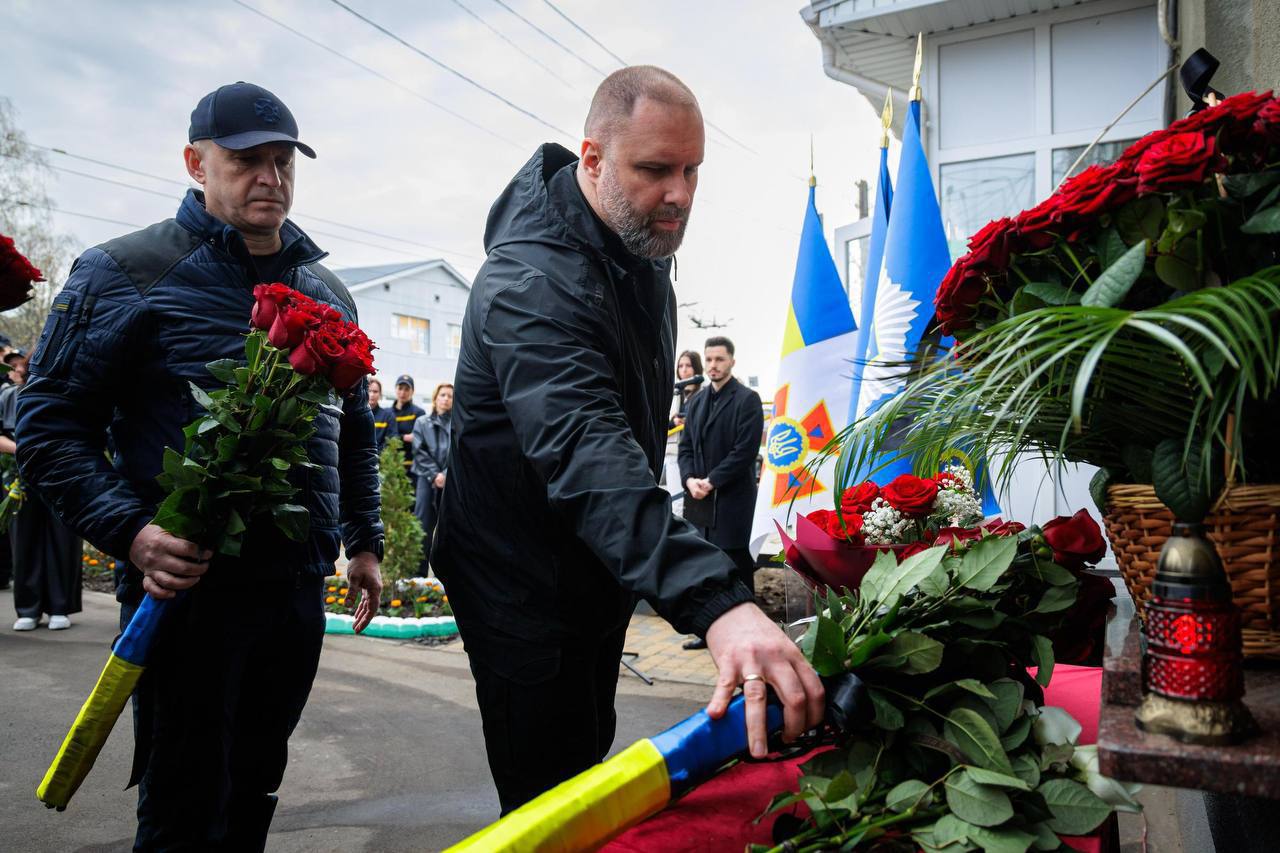 Голова обладміністрації, начальник ГУ ДСНС України в Харківській області та колеги загиблих поклали квіти до меморіальної дошки, присвяченої загиблим та встановленої на місці удару.