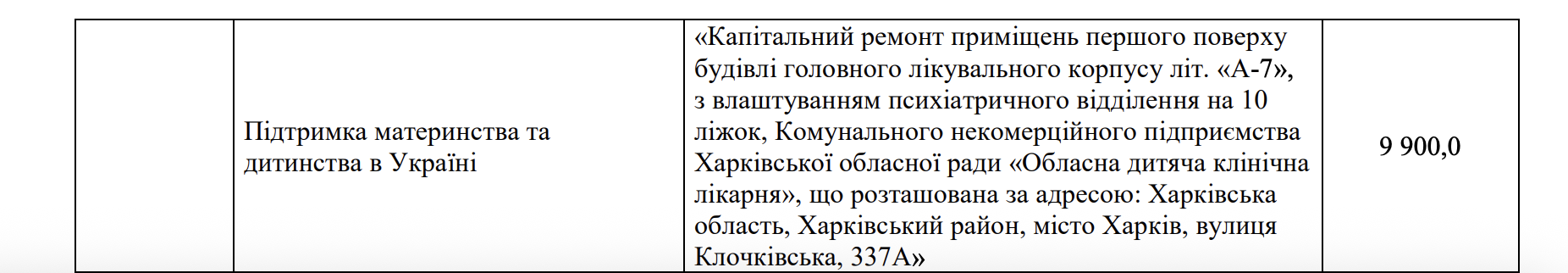 - Нове будівництво шахти медичного ліфту та капітальні ремонти у дитячій обласній лікарні – понад 30 млн грн сумарно, включно з облаштуванням психіатричного відділення на 10 ліжок.